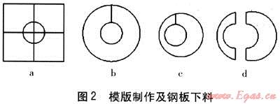 ③ 將剪好的工程紙?zhí)兹肴細夤艿溃采w到套管上,用錘子垂直擊打工程紙,得到管道與套管之間圖形的壓環(huán)模版,見圖2c。