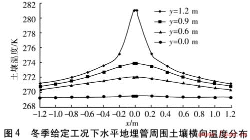 由圖3可知,土壤溫度沿縱軸方向成不對(duì)稱單峰狀分布,經(jīng)分析可得到如下結(jié)論:①?gòu)牡芈窆芩谖恢脃=1.2m沿縱向向兩側(cè)遠(yuǎn)離地埋管,土壤溫度逐漸降低。在x=0.3、0.6、1.2m的3條縱軸上,溫度曲線存在以y=1.2m為中心向兩側(cè)下降趨勢(shì),即土壤溫度在y=1.2m處溫度最高,向兩側(cè)降低。值得注意的是,在x=0這條縱軸上,溫度分布不連續(xù),在地埋管外壁最上端y=1.1855m與最下端y=1.2145m之間間斷,這是水平地埋管位置所在。②以y=1.2m為中心,每條溫度曲線的左半部都要比右半部陡,且不以y=1.2m為中心對(duì)稱。這是由于地埋管上方土壤(y<1.2m)比下方土壤(y>1.2m)受大氣溫度影響更大。③4條曲線的變化幅度不同,說(shuō)明隨著位置橫向遠(yuǎn)離地埋管,土壤溫度的縱向變化逐漸趨緩。