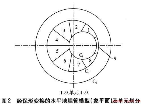 以水平地埋管換熱器土壤源熱泵為研究對(duì)象,建立水平地埋管的二維數(shù)學(xué)模型,該模型屬于圓柱理論模型。水平地埋管模型(原平面)及測(cè)點(diǎn)布置見(jiàn)圖1。采用邊界離散法對(duì)水平地埋管換熱器的熱力狀況進(jìn)行分析,通過(guò)保形變換(見(jiàn)圖2)、分離變量及區(qū)域銜接得到了溫度場(chǎng)的級(jí)數(shù)解。在確定級(jí)數(shù)各項(xiàng)系數(shù)時(shí),對(duì)于正交部分,采用傳統(tǒng)的Fourier方法;對(duì)于非正交部分,采取積分邊界元的方法[3~5]。模型軟件采用VB編制,計(jì)算水平地埋管及其周圍壤溫度場(chǎng)、熱流量分布、單位管長(zhǎng)換熱量。