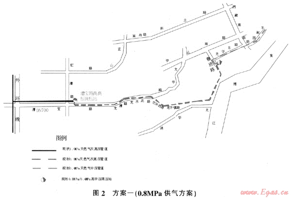 經(jīng)過(guò)與市規(guī)劃部門(mén)的征詢,認(rèn)為該方案中初步確定的高壓站站址(龍華東路、魯班路口)無(wú)法實(shí)施,由于沒(méi)有管位,0.8MPa次高壓管道無(wú)法敷設(shè)到魯班路。