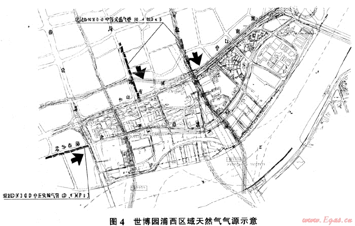 浦西世博園區(qū)天然氣氣源,由于受消防安全間距、管位、調(diào)壓站建設(shè)用地等條件的限制,規(guī)劃自漕寶路高中壓調(diào)壓站,延伸0.4MPa中壓管道至宜山路、斜土路,再?gòu)拿勺月?、局門(mén)路、制造局路、西藏南路、保屯路以及南車站路路口接出,向園區(qū)的用戶供應(yīng)天然氣。