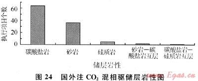 隨著全球?qū)O2排放引起大氣污染的日益重視,注CO2資源化利用潛力越來越大,其項目占了絕大部分。在我國開展了很多注CO2的吞吐項目,部分CO2驅(qū)也在實施。國家也很重視CO2排放及資源利用,專門批準“973”項目“溫室氣體提高石油采收率的資源化利用及地下埋存”,還設(shè)置了國家重大專項和“863”重點項目,對CO2埋存及資源化利用的各個方面進行了全面研究。但我國目前大多數(shù)項目都未實現(xiàn)CO2混相驅(qū)。對國外2008~2009年注CO2混相驅(qū)的108個項目進行統(tǒng)計,表明國外注CO2混相驅(qū)原油黏度主要分布在0.8~1.2mPa·s,溫度主要分布在30~60℃,儲層深度在600~2000m的較多,碳酸鹽巖注氣滲透率主要在(0.1~10)×10-3μm2及(10~50)×10-3μm2范圍內(nèi),砂巖中注CO2是滲透率大于10×10-3μm2的油藏??梢妵庵饕菍μ妓猁}巖油藏進行混相驅(qū)(圖24)。當(dāng)然其原油組成對混相壓力影響也較大,但由于沒有公布的數(shù)據(jù),因此這里未列出[9~10]。