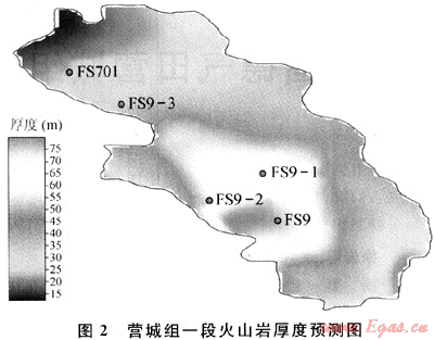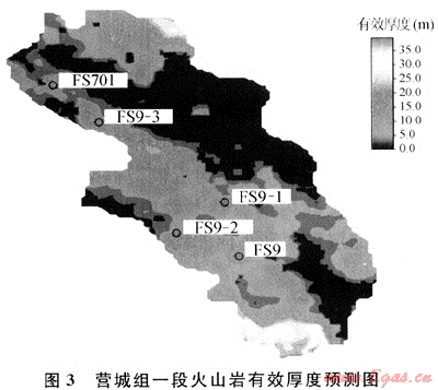 3) 屬性模型。研究區(qū)屬性建模采用測井曲線生成法,利用井筒巖石密度曲線數(shù)據(jù)建立密度模型[4]。由于火山巖與圍巖的區(qū)分十分復(fù)雜,單一屬性不能很好描述儲層分布[5],所以采用巖石密度和伽馬曲線這兩種對火山巖儲層較敏感參數(shù)進(jìn)行建模,所以本區(qū)建立了密度和伽馬模型,并根據(jù)有效厚度劃分標(biāo)準(zhǔn),預(yù)測了營城組一段有效厚度分布。本次建模過程中將密度曲線粗化后,進(jìn)行變差函數(shù)分析,正確的變異函數(shù)估計(jì)要求對采樣方式、均值變化或樣品承載大小以及變異函數(shù)對方位變化的敏感性作出全面的評價(jià)。然后用密度反演體作為協(xié)變量,進(jìn)行10次隨機(jī)實(shí)現(xiàn)[6~7]。圖2為通過昌德氣田的密度屬性模型得出的營一段儲層厚度預(yù)測圖,F(xiàn)S9區(qū)塊發(fā)育一個(gè)經(jīng)過FS701、FS9-1、FS9井的北西向火山巖條帶。