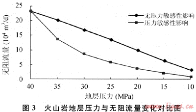巖心實驗表明,火山巖儲層具有很強的壓力敏感性。以實驗數(shù)據(jù)為基礎數(shù)據(jù),假定儲層有效厚度50m,流動半徑700m,未考慮壓裂改造影響,采用擬穩(wěn)態(tài)氣井產能公式,分別計算了無壓敏影響和有壓敏影響下的氣井產能變化情況,從計算結果看(圖3),在考慮壓敏影響下隨著地層壓力的下降,氣井產能與無壓敏影響下的產能有較大的差距,最高損失達到70%。