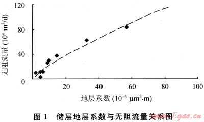 試采表明,氣井產能與可流動區(qū)域的地層系數(shù)具有一定的相關性,氣井的無阻流量隨著地層系數(shù)的增加而增大(圖1)。同樣儲層有效流動區(qū)域的過膜也影響到氣井的產能,規(guī)模越大,單位壓降下的采氣量也就越高。