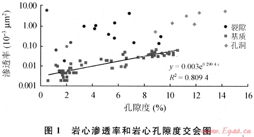 徐深氣田火山巖儲層野外露頭觀測發(fā)現(xiàn),構(gòu)造裂縫和原生收縮縫普遍發(fā)育[2~3]。根據(jù)巖心的宏觀和微觀統(tǒng)計,該區(qū)裂縫以高角度斜交裂縫和垂直裂縫為主,所占比例分別為35%和45%;低角度裂縫和水平裂縫發(fā)育程度較低,只占16%和4%。巖心觀測表明,在2804條裂縫市有62.8%是開啟的,裂縫張開度平均值0.1mm。利用全直徑巖心分析數(shù)據(jù),建立巖心滲透率和巖心孔隙度交會圖(圖1),圖版中明顯低孔、高滲的點代表裂縫發(fā)育,為裂縫發(fā)育區(qū)。巖心觀測和分析表明:徐深氣田火山巖儲層為裂縫-孔隙型儲層。