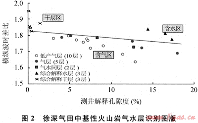 理論上當(dāng)?shù)貙雍瑲鈺r(shí),由于天然氣比液體更容易壓縮,因此含氣巖石的縱波速度一般比含液體巖石的速度低,即縱波時(shí)差(△Tc)在氣層處變大;而橫波時(shí)差(△Ts)卻變化極小。同時(shí)由于地層巖性、物性的變化同樣也可能引起速度的改變,因此單純應(yīng)用縱波時(shí)差去識(shí)別天然氣,存在著一定的風(fēng)險(xiǎn)性,但如果通過(guò)比較橫波和縱波的速度差異來(lái)判別氣層,則要可靠得多。故可據(jù)此來(lái)進(jìn)行流體識(shí)別。