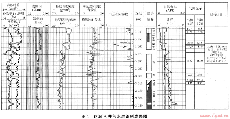 中基性火山巖儲(chǔ)層氣水層識(shí)別是一項(xiàng)較為困難的工作,僅靠單一識(shí)別方法在實(shí)際工作中存在一定的局限性。為避免在測(cè)井解釋中出現(xiàn)的氣層誤判、漏判現(xiàn)象,綜合以上3種方法,應(yīng)用綜合概率法,制定了一個(gè)氣層指示參數(shù),氣層指示參數(shù)越大,表明該井段含氣性更好。如圖1達(dá)深A(yù)井氣層指示參數(shù)曲線最高的186Ⅲ號(hào)層,其對(duì)應(yīng)的錄井氣測(cè)比值也是最高的,氣測(cè)比值達(dá)到121.5;而氣層指示參數(shù)曲線為零或?yàn)椴贿B續(xù)的零星小段處,錄井均未見(jiàn)氣測(cè)顯示,綜合解釋為干層或水層,說(shuō)明氣層指示參數(shù)曲線與含氣性一致性較好。