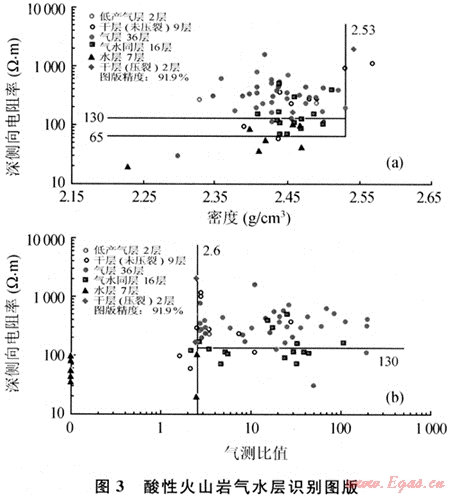 在儲層“四性”關系研究的基礎上,通過敏感性分析,確定了最能反映儲層流體性質(zhì)特征的參數(shù)電阻率、密度和氣測比值,建立了酸性火山巖氣水層解釋圖版(圖3),圖版精度都超過90.0%,達到了儲量規(guī)范的要求。