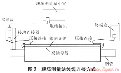現(xiàn)場測量站線纜連接方式見圖9。主要連接裝置有:現(xiàn)場測量站小室內安裝漏點檢測模塊、通信模塊等;現(xiàn)場測量站小室與接線盒之間的連接電纜;帶有接地連接器的接線盒;用于連接感測導線與反饋導線的終端盒等?,F(xiàn)場測量小室、接線盒、終端盒、連接電纜的防護等級均為IP65。