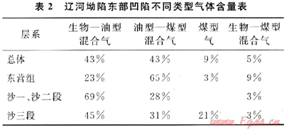 總體上,以生物-油型混合氣和油型-煤型混合氣為主,各占43%,煤型氣和生物~煤型混合氣含量較少,分別占總體的9%和5%。東營組以油型煤型混合氣為主,占到東營組的65%,沙一段和沙二段以生物-油型混合氣為主體,占沙一段、沙二段樣品的69%;沙三段幾種類型天然氣都占有一定的比例,相對其他的層段,煤型氣的含量有所上升,達到21%。