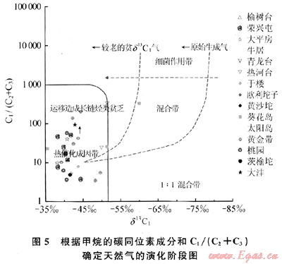依據(jù)國內(nèi)外文獻資料[2~4,14~19],該區(qū)天然氣的演化階段劃分為生物成因氣、熱催化過渡帶氣、熱解氣、裂解氣4個階段。應(yīng)用乙烷和甲烷碳同位素分析,看出該區(qū)存在著大量的混源氣?;煸礆饩哂幸彝樘纪凰剌^重,而甲烷碳同位素較輕的特征,例如黃金帶、熱河臺、榮興屯可能均存在著生物成因氣與熱解氣的混源。