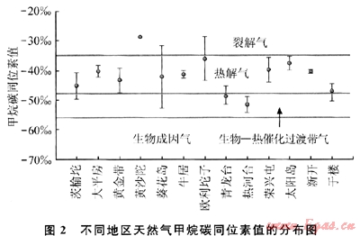 該區(qū)天然氣的碳同位素以-42‰占優(yōu)勢,甲烷碳同位素分布的主要范圍為-35‰~-55‰。按不同的地區(qū)對甲烷同位素值進行統(tǒng)計,可知各個地區(qū)天然氣的甲烷碳同位素值主要處于熱解氣階段(圖2)。