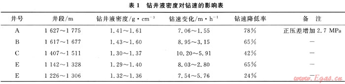 通過(guò)統(tǒng)計(jì)分析川西地區(qū)5口深井實(shí)鉆資料,認(rèn)為以下鉆井液因素對(duì)鉆速存在影響。