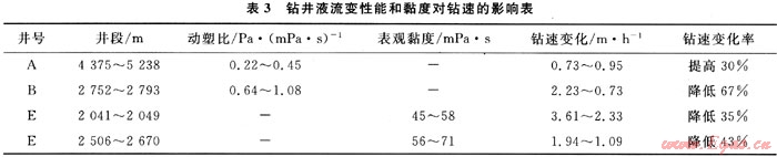 鉆井液流變性能和黏度是影響鉆速的重要因素,其好與差可導(dǎo)致超過(guò)30%的鉆速變化(表3)。因此,在鉆井中應(yīng)注意維護(hù)鉆井液良好的流變性能和合適的黏度,以此來(lái)提高鉆井速度。