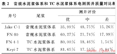 TC柔性水泥漿體系在蘇丹6區(qū)7口井的Φ244.5mm中間套管固井中得到了成功應(yīng)用,聲波測井結(jié)果為:優(yōu)質(zhì)率平均提高30%以上,不合格率平均下降了15%。表2是蘇丹6區(qū)采用常規(guī)水泥漿體系和TC水泥漿體系封固Φ244.5mm套管的固井質(zhì)量對比結(jié)果,分別取自各井完井前CBL電測評價資料,數(shù)據(jù)顯示應(yīng)用TC柔性水泥漿體系后固井質(zhì)量顯著提升。