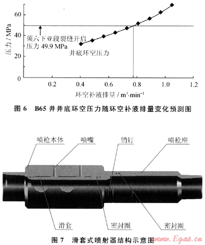 如圖6所示,在設(shè)計865井須六上亞段水力噴射壓裂時,當(dāng)環(huán)空補液排量達到0.7m3/min,井底環(huán)空壓力就超過已經(jīng)壓裂的須六下亞段的裂縫開啟壓力,因此須六上亞段的環(huán)空補液排量的上限就是0.7m3/min。