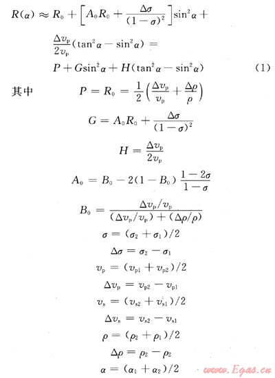 Zoeppritz理論是AV0技術(shù)的核心,完整的Zoeppritz方程[2]全面考慮了平面縱波和橫波入射在平界面兩側(cè)產(chǎn)生的縱橫波反射和透射能量之間的關(guān)系。當反射波地震勘探使用主要產(chǎn)生縱波的震源、接收的是反射縱波時,Zoeppritz公式可以被大大簡化,即只考慮平面縱波入射產(chǎn)生的反射振幅隨入射角的變化情況。一方面可以節(jié)省計算工作量,另一方面更有利于AV0技術(shù)的研究和應(yīng)用。R.T.Shuey給出的簡化公式是目前人們使用最多的Zoeppritz近似方程[3]: