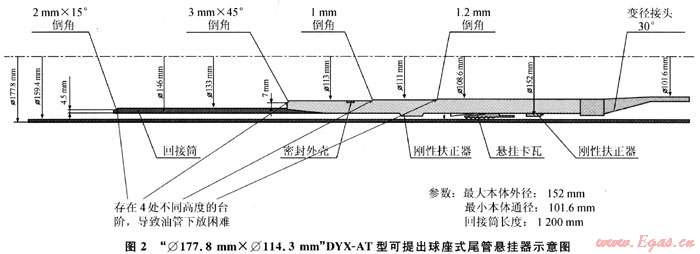 1) 水平井Φ114.3mm尾管懸掛器與Φ177.8mm套管(內(nèi)徑Φ159.42mm)座掛后,懸掛器回接筒(外徑Φ146mm)與Φ177.8mm套管內(nèi)壁之間的間隙為6.71mm,加上回接筒壁厚6.5mm,懸掛器端面與Φ177.8mm套管內(nèi)壁間有13.21mm高的臺階,除去回接筒端面2mm×15°倒角,兩者間最小也有11.21mm的臺階,不利于Φ93×2mm的油管喇叭口進入回接筒內(nèi),導致油管下放困難(圖2)。