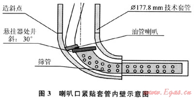 3) 目前尾管懸掛器座掛位置一般位于井斜30°左右處。因此,油管喇叭口在經(jīng)過該井段時其端面勢必緊貼套管內(nèi)壁,致使無法順利進入懸掛器回接筒內(nèi)(圖3)。