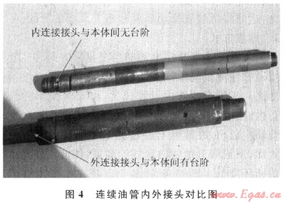 針對以上問題,采用流量計算公式驗證連續(xù)油管內(nèi)連接接頭(內(nèi)徑:11mm,外徑:38.1mm)最大允許施工排量,由結(jié)果可知參數(shù)滿足水平井改造要求,因此采用連續(xù)油管內(nèi)連接接頭,使接頭與本體外徑一致,消除了遇阻遇卡風險(圖4)。在某井上使用連續(xù)油管內(nèi)連接接頭,順利實施了連續(xù)油管水平段洗井替泥漿和拖動布酸作業(yè),優(yōu)化效果明顯。