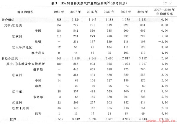 對(duì)天然氣已探明儲(chǔ)量的認(rèn)識(shí)大家比較一致,對(duì)于已知?dú)馓锏膬?chǔ)量增長(zhǎng)量、待發(fā)現(xiàn)天然氣的常規(guī)資源量和非常規(guī)資源量有許多機(jī)構(gòu)和學(xué)者做過(guò)預(yù)測(cè)。在此基礎(chǔ)上國(guó)際能源署(IEA)在2008年對(duì)世界天然氣產(chǎn)量進(jìn)行了預(yù)測(cè)(表3)。