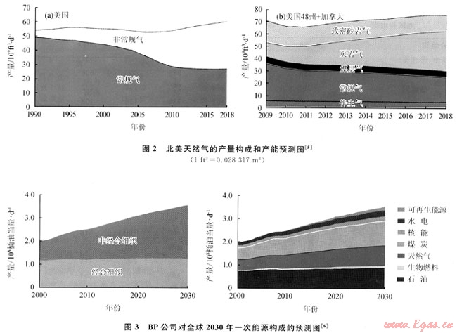 表4表明,2009年美國(guó)的天然氣儲(chǔ)量為6.93×1012m3,而俄羅斯為44.38×1012m3,美國(guó)的儲(chǔ)量?jī)H為俄羅斯的15.6%。如果從儲(chǔ)量和產(chǎn)量的相關(guān)性而言,很難理解美國(guó)的產(chǎn)量超過(guò)俄羅斯這個(gè)事實(shí)。其根本原因是,由于非常規(guī)天然氣的特殊性,雖已有很高產(chǎn)量,但仍未計(jì)入儲(chǔ)量數(shù)據(jù)統(tǒng)計(jì)。2009年美國(guó)的非常規(guī)天然氣的產(chǎn)量幾乎與常規(guī)氣相當(dāng)。根據(jù)劍橋能源的預(yù)測(cè)[5],未來(lái)的美國(guó)和整個(gè)北美(包括加拿大)的非常規(guī)天然氣產(chǎn)量將超過(guò)常規(guī)氣,其中頁(yè)巖氣將起到重要作用(圖2)。