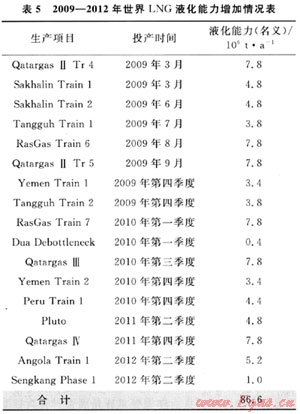 5) 中東在建的LNG項(xiàng)目在未來(lái)幾年還將投入生產(chǎn)。澳大利亞煤層氣液化的LNG將有大的發(fā)展,正建或待建的項(xiàng)目共有8個(gè),產(chǎn)能超過(guò)5000×104t/a。據(jù)IHS(Information Handling Service)公司的資料,2009—2012年新增的LNG產(chǎn)能將達(dá)到8660×104t/a(表5)。