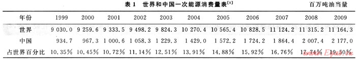 世界一次能源消費(fèi)量除2009年的金融危機(jī)造成下降外,其他各年均逐漸上升,10年總計(jì)上升了12.4%。中國(guó)的一次能源消費(fèi)量,一直處于上升狀態(tài),金融危機(jī)也沒(méi)有影響其上升的勢(shì)頭(表1),10年總計(jì)上升了133%。中國(guó)的一次能源消費(fèi)量從1999年占世界的10.3%提高到2009年的19.5%,共提高了9.2個(gè)百分點(diǎn),成為全球一次能源消費(fèi)量增長(zhǎng)最快的國(guó)家。中國(guó)正處于工業(yè)化和城市化發(fā)展階段,未來(lái)一次能源消費(fèi)量仍將快速增長(zhǎng),對(duì)中國(guó)能源供給能力產(chǎn)生了巨大的壓力,化石能源消費(fèi)量在相當(dāng)長(zhǎng)的時(shí)間內(nèi)仍將增長(zhǎng)。