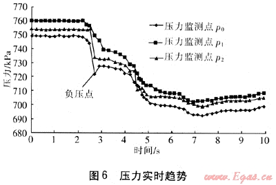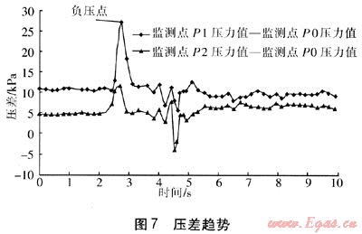 圖6為SCADA系統(tǒng)提供的壓力實(shí)時(shí)趨勢(shì),P0是距離泄漏點(diǎn)最近的壓力測(cè)點(diǎn),P2次之,P1最遠(yuǎn)。由于負(fù)壓波傳輸需要一定的時(shí)間,P0具有明顯的負(fù)壓點(diǎn),P1和P2的負(fù)壓點(diǎn)不太明顯。圖7為壓差趨勢(shì),通過壓差比對(duì)判定壓差波動(dòng)最大的時(shí)刻發(fā)生泄漏,泄漏位置在P0附近。在試驗(yàn)過程中,城市燃?xì)夤芫W(wǎng)泄漏在線檢測(cè)軟件同步運(yùn)行,得出的結(jié)果與試驗(yàn)實(shí)測(cè)結(jié)果對(duì)比,即可判定出軟件的準(zhǔn)確度。