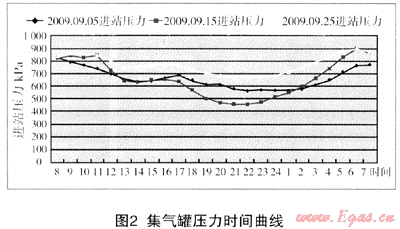 (2) 省公司對寶雞中燃實行均衡供氣。寶雞中燃用球罐進(jìn)行日調(diào)峰,大多都是晚上進(jìn)氣,白天出氣模式。匯一集氣罐上2009.09.05,2009.09.15,2009.09.25三天時間壓力曲線如圖2,基本上反映出匯一集氣罐壓力時間曲線。