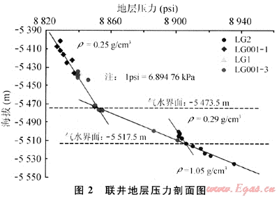 電纜式地層測試器的應(yīng)用實(shí)踐表明,一個(gè)構(gòu)造上的同井同層或不同井但同層的氣、水井(段)可進(jìn)行壓力系統(tǒng)分析,判斷儲(chǔ)層的橫向連通性,并用壓力梯度交會(huì)法確定區(qū)域上的氣水界面[1~3]。