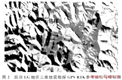 在GIS中利用數(shù)字高程模型,合理布設(shè)測量控制點(diǎn),提前進(jìn)行GPS基準(zhǔn)站的信號覆蓋情況模擬(圖2),并結(jié)合交通路線的分布情況,合理安排導(dǎo)線小組開始施測的位置,從而保證每個(gè)GPS施測小組在交通最方便的地方開始施測并能最大范圍地接收到來自GPS基準(zhǔn)站的GPS信號。如遇深溝或夾溝等信號盲區(qū),利用地形高差變化和交通情況,合理調(diào)配和架設(shè)中繼站,提高施測效率。