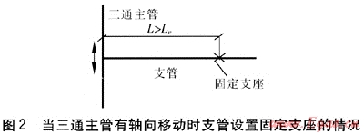當(dāng)在支管上無(wú)法實(shí)現(xiàn)自然補(bǔ)償時(shí),可以考慮在支管上設(shè)置軸向補(bǔ)償器,軸向補(bǔ)償器的類(lèi)型可根據(jù)供回水溫度、支管的管徑及其他技術(shù)要求選用。當(dāng)三通主管無(wú)軸向移動(dòng)時(shí),支管設(shè)置軸向補(bǔ)償器的情況見(jiàn)圖5。為了降低支管的軸向移動(dòng)對(duì)三通的推力,軸向補(bǔ)償器距三通的距離L應(yīng)滿足L≤20m[7]。