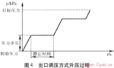 采用調(diào)壓器出口調(diào)壓方式進(jìn)行調(diào)壓時(shí),需設(shè)置的狀態(tài)參數(shù)包括壓力步長(zhǎng)、靜止時(shí)間、目標(biāo)壓力。壓力步長(zhǎng)是連續(xù)動(dòng)作的壓力變化值。靜止時(shí)間是每個(gè)壓力步長(zhǎng)動(dòng)作完成后至下一步長(zhǎng)開始的停頓時(shí)間。目標(biāo)壓力是需升壓或降壓后達(dá)到的壓力??刂破靼丛O(shè)定的壓力步長(zhǎng)、靜止時(shí)間運(yùn)行,出口壓力傳感器將出口壓力p的信號(hào)反饋到控制器,當(dāng)p等于目標(biāo)壓力時(shí),升壓或降壓停止。圖4為采用出口調(diào)壓方式進(jìn)行升壓的過程。