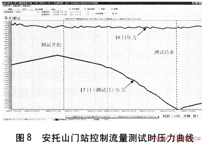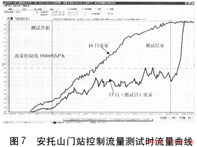 目前兩座門站沒有設(shè)置限流裝置,上游也沒有對(duì)門站采取限流。當(dāng)出站壓力保證穩(wěn)定,不采取降壓以利用次高壓管道的管道儲(chǔ)氣的情況下,在用氣高峰時(shí)段,流量超過合同規(guī)定的最大提取速率,超過最大提取速率提取的氣量將按正常價(jià)格的150%計(jì)價(jià)。針對(duì)以上實(shí)際情況,將壓力遙調(diào)的功能進(jìn)行拓展,通過在高峰時(shí)段降低出口壓力,減小調(diào)壓器開度,從而間接地降低流量。在高峰時(shí)段需頻繁降壓,將流量控制在上游要求的最大提氣速率的95%以內(nèi),用戶需求的不足部分通過降低管道壓力、利用管道儲(chǔ)氣來補(bǔ)充。低峰時(shí)升高壓力來補(bǔ)充管道儲(chǔ)氣。這種頻繁的調(diào)整,在沒有遙調(diào)系統(tǒng)的情況下是很難實(shí)現(xiàn)的。圖7、8為改造后安托山門站晚高峰控制流量測(cè)試時(shí)的流量、壓力曲線。