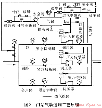 深圳市燃?xì)饧瘓F(tuán)股份有限公司門站氣動(dòng)遙調(diào)系統(tǒng)的工藝原理見圖3。