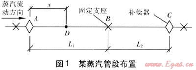 某蒸汽管段布置見(jiàn)圖1。長(zhǎng)度為L(zhǎng)1、L2的兩段直管段,設(shè)置3個(gè)固定支座和兩個(gè)波紋管補(bǔ)償器A、C。設(shè)暖管前鋼管溫度為θ1、暖管蒸汽溫度為θ2、管道單位長(zhǎng)度質(zhì)量為ml。蒸汽由A端進(jìn)入,流速為v。與直徑相比,鋼管的壁厚較小,且鋼材的熱導(dǎo)率較大,忽略管壁的溫升過(guò)程,即按蒸汽到達(dá)之處管壁溫度與蒸汽溫度相同考慮。當(dāng)暖管蒸汽到達(dá)點(diǎn)A,并從點(diǎn)A繼續(xù)向前流動(dòng)一段距離菇到達(dá)點(diǎn)D時(shí),管段AD伸長(zhǎng)量的計(jì)算式為: