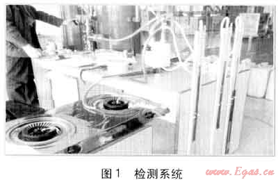 檢測工具及設備有:秒表、膠管、鐘罩1臺、U形管3只、雙眼灶具2臺、單眼灶具1臺。檢測系統(tǒng)見圖1。