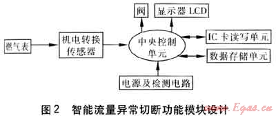 中央控制單元是安全智能燃氣表的核心。通過IC卡讀寫單元將民用燃氣異常流量參數(shù)傳入燃氣表的中央控制單元,并保存到數(shù)據(jù)存儲單元中,作為異常流量的判斷依據(jù)。當前的瞬時流量信號從燃氣表通過機電轉(zhuǎn)換傳感器讀入到中央控制單元后,由中央控制單元計算出當前燃氣表的瞬時流量值,并與異常流量范圍進行比較。當確認流量異常時,中央控制單元發(fā)出關閥操作信號,閥門關閉,顯示器顯示異常提示,并形成記錄,通過TC卡或無線形式反饋到管理系統(tǒng),供故障分析。