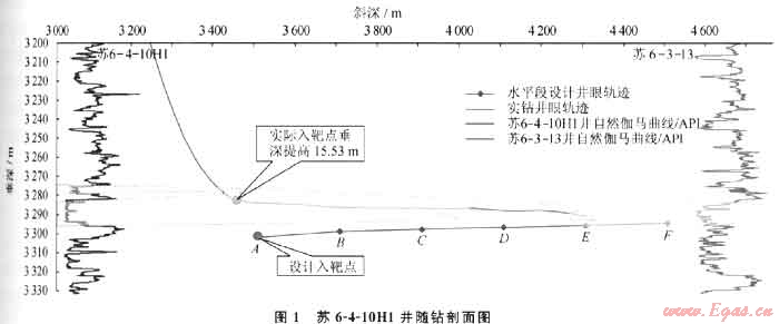 之前為防止水平段鉆進時鉆頭從氣層底部穿出,入靶深度均按氣層以下1m左右設(shè)計,入靶深度過淺,因此而帶來的問題之一是無法清楚了解靶點以下氣層情況,發(fā)生變化不能及時采取應(yīng)對措施。典型井蘇36-8-18H,入靶點進入目標氣層垂厚僅0.64m,水平段鉆進157m即鉆遇泥巖,后調(diào)整井斜向下追蹤體,垂深下降9.2m,終因泥巖段過長,施工困難而完鉆。