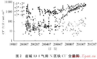 Cl-含量的變化在一定程度上反映地層水的侵入程度,當氣井所產(chǎn)水由凝析水變?yōu)檫叺姿畷r,Cl-含量或礦化度有較大的變化。通過對氣田單井Cl-含量分析,證明部分井在2006年后受地層水侵入(圖2)。