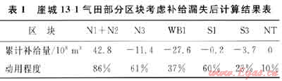借鑒物質(zhì)平衡原理,將氣藏模擬為單獨儲罐體,并考慮有外來氣體通過薄的可滲透邊界不斷流入氣藏的情況下,建立新的補給氣藏物質(zhì)平衡方程,計算出氣田區(qū)塊間存在的補給漏失量(表1),其中N區(qū)塊補給量高達近43×108m3,很好地解釋了動用程度超百的現(xiàn)象,考慮補給后動用程度為86%,而其余區(qū)塊考慮漏失后動用程度相應有所增加。
