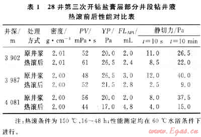 28井在第三次開鉆鹽膏層期間除采用高濃度(5%~8%)SMP和SMC三磺材料膠液外,性能維護(hù)時(shí)還不斷補(bǔ)充FT-1A、PAC等護(hù)膠劑進(jìn)入體系。表1為28井第三次開鉆鹽膏層部分井段鉆井液在150℃熱滾前后性能變化對(duì)比表。不同井段鉆井液經(jīng)過150℃熱滾后,鉆井液各項(xiàng)性能保持穩(wěn)定,甚至出現(xiàn)了性能越熱滾越好的現(xiàn)象。這是黏土高溫水化分散和處理劑護(hù)膠作用相互抵消和補(bǔ)償后的綜合結(jié)果;此現(xiàn)象同時(shí)也說(shuō)明盡管黏土受到高溫水化分散后使其顆粒濃度相對(duì)增加,但由于鉆井液內(nèi)有足量的護(hù)膠劑吸附在其顆粒上面,致使黏土顆粒之間不能發(fā)生“面-面”形式的聚結(jié),從而穩(wěn)定了鉆井液的整體性能。