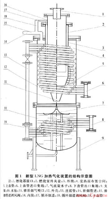 關鍵詞:LNG加熱氣化裝置;煙氣自擊回旋;結(jié)構(gòu)設計;氣流旋水子;錐形煙氣噴口;自動注水;試驗研究