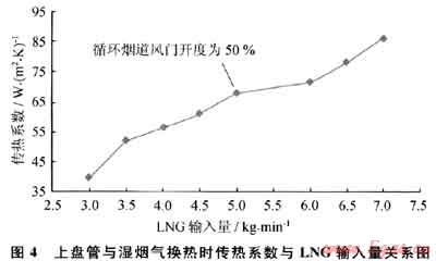 圖4為上盤管與濕煙氣換熱時傳熱系數(shù)與LNG輸入量的關系圖。反映了當燃料天然氣輸入熱負荷不變、循環(huán)煙道調(diào)風門的開度為50%時,濕煙氣與上盤管換熱的傳熱系數(shù)與LNG輸入量之間的關系,此時上盤管外濕煙氣量基本不變,傳熱系數(shù)的變化主要由管內(nèi)LNG的對流換熱系數(shù)決定。隨著LNG輸入量的增大,其管內(nèi)流速上升,導致上盤管傳熱系數(shù)增大,且隨著LNG輸入量的增大,在輸入熱負荷不變時,其溫升下降,從而增大了管內(nèi)外的傳熱溫差,促進了傳熱。