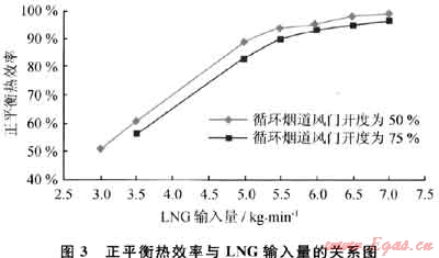 圖3為正平衡熱效率與LNG輸入量的關系圖。從圖3可以看出,裝置正平衡熱效率隨工質(zhì)LNG輸入量的增大而提高,當循環(huán)煙氣量增大(即循環(huán)煙道調(diào)風門的開度從50%增大到75%)時,裝置正平衡熱效率反而降低,原因是循環(huán)煙氣量增大,導致混合煙氣溫度降低,使傳熱溫差減小,LNG的吸熱量降低。