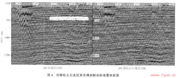 三湖地區(qū)地表相對(duì)平坦,以往該區(qū)資料處理采用高程靜校正,導(dǎo)致在很多近地表異常地區(qū)地面資料較差。通過(guò)近兩年的研究,認(rèn)識(shí)到該區(qū)的速帶變化劇烈,存在較多的局部低降速帶異常。對(duì)靜校正方法的分析,最終確定了適合本區(qū)法——折射靜校正方法?;谀P图s束的折射靜方法能提供高質(zhì)量的中、長(zhǎng)波長(zhǎng)分量,同時(shí),其短靜校正精度也較高。在實(shí)際靜校正工作中,主要了以下技術(shù)要點(diǎn):①通過(guò)詳細(xì)的近地表結(jié)構(gòu)的整剖,準(zhǔn)確建立近地表模型,為折射靜校正提供了合模型約束參數(shù);②通過(guò)對(duì)湖區(qū)、鹽堿地、鹽堿沼澤層含氣區(qū)等表層結(jié)構(gòu)對(duì)大炮初至質(zhì)量影響較大區(qū),采用處理手段提高初至質(zhì)量,提高了折射靜枝這些區(qū)域的應(yīng)用精度;③通過(guò)提高折射波的識(shí)別、的折射分層、消除排列邊界效應(yīng)的延遲時(shí)延拓,劉析反演模型,確定合理的靜校正計(jì)算標(biāo)志層,最大地解決了該區(qū)存在的靜校正問(wèn)題,消除了一些表常的影響(圖4)。