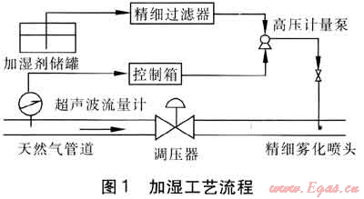 結(jié)合青島市燃氣管網(wǎng)的實際運行情況,自行設(shè)計了噴霧加濕工藝流程,見圖1。