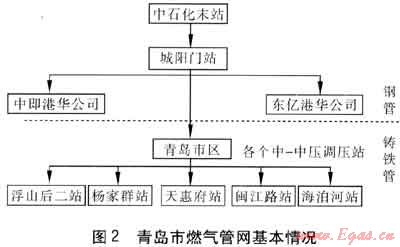 青島市燃氣管網(wǎng)的基本情況見圖2。市區(qū)所使用的天然氣主要來自中石化末站,經(jīng)過城陽門站計量后,分別供給青島市區(qū)、中即港華公司和東億港華公司。中即港華公司和東億港華公司所建管網(wǎng)全部采用鋼管,不存在接口漏氣現(xiàn)象,因此不需要加濕。進入市區(qū)的天然氣先經(jīng)過21km輸氣管道后分到各中-中壓調(diào)壓站,經(jīng)調(diào)壓后進入中壓B管網(wǎng)。這21km輸氣管道也全部是鋼管,因此也不存在接口漏氣現(xiàn)象。